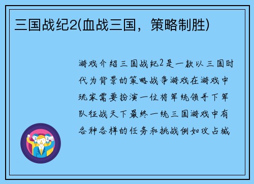 三国无双3下载(下载三国无双3,畅玩经典战斗场景!)三国无双3是一款由光荣公司开发的动作类游戏,在游戏市场上备受玩家们的喜爱。本文将从游戏简介、游戏特点、玩法介绍以及下载方法四个方面详细介绍这款游戏,...